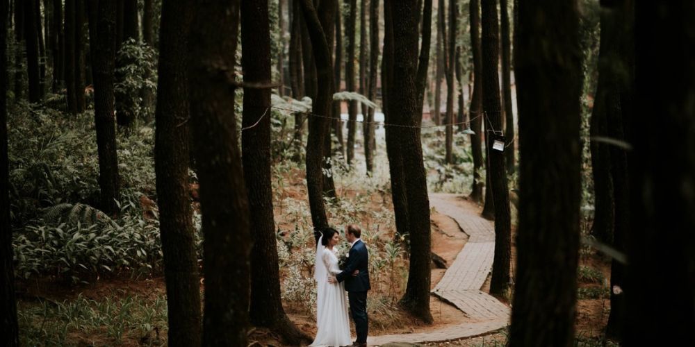 Pernikahan romantis dengan latar alam hutan pinus yang indah.